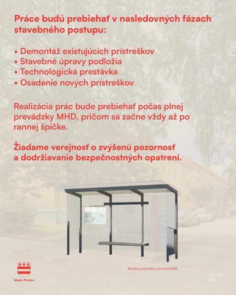 V Prešove sa v auguste 2025 spúšťa historicky najväčšia výmena prístreškov MHD v meste. Do roku 2027 by sa za novšie a modernejšie verzie malo vymeniť 104 prístreškov. Postupovať sa bude po fázach, pričom prvá štartuje už 11.8. Do konca roka 2025 sa obmení 33 prístreškov po celom meste.