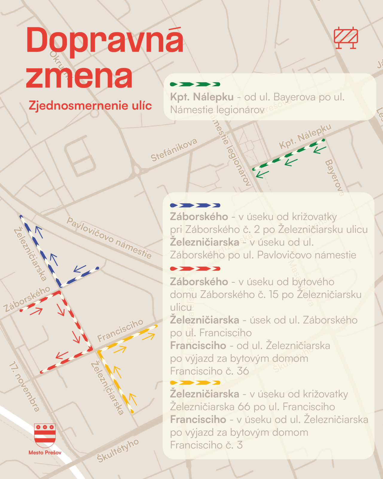 * v prvej časti bude Železničiarska zjednosmernená v smere od Škultétyho ulice na Pavlovičovo námestie, ale až od odbočky na Železničiarskej 66 po križovatku s Francisciho ulicou,