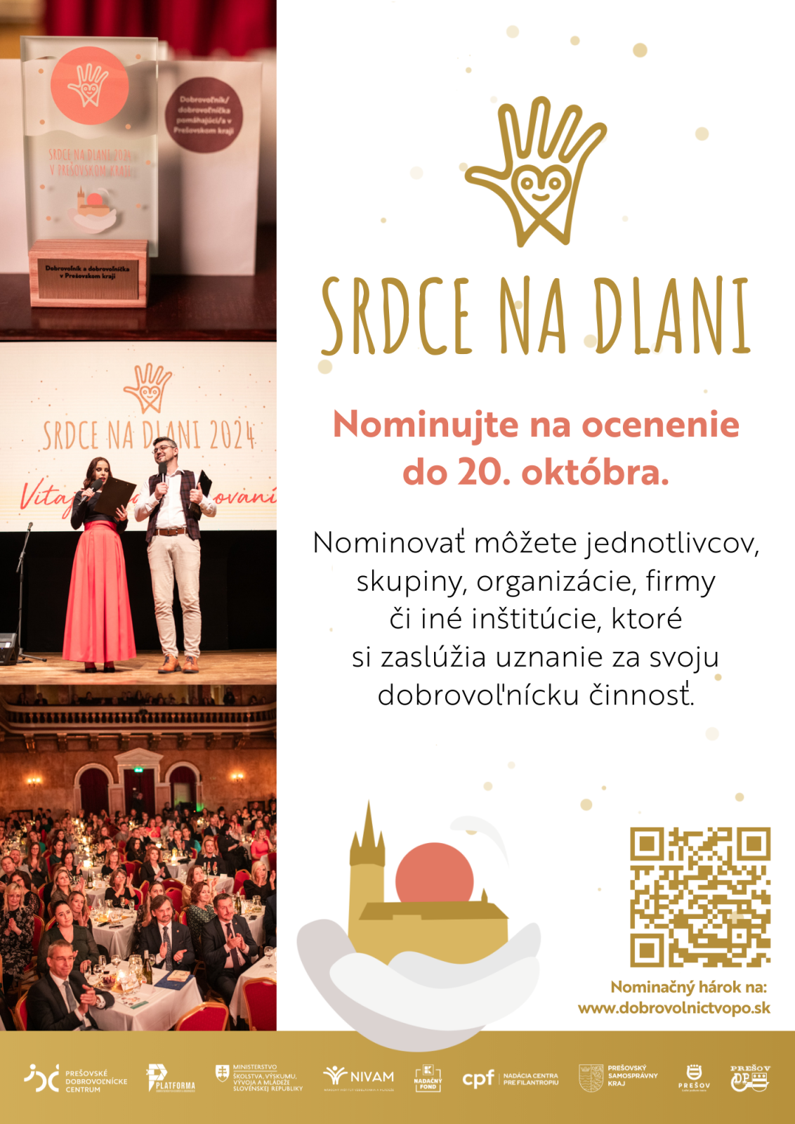 Oceňovanie inšpiratívnych dobrovoľníckych skutkov a projektov v Prešovskom kraji Srdce na dlani sa uskutoční aj tento rok. Nominácie v 9 kategóriách môžete zasielať od 16. septembra do 20. októbra 2025.