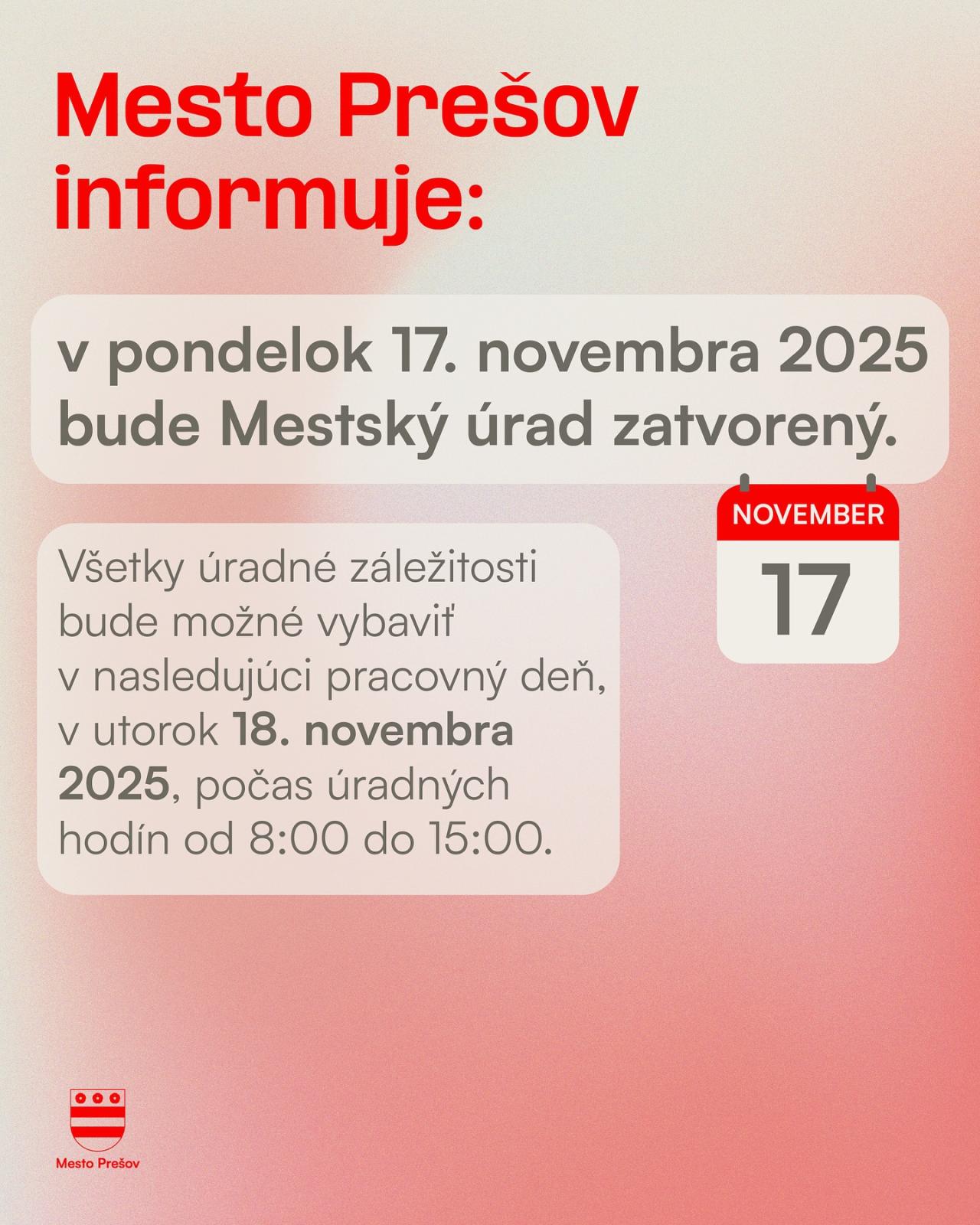 Mesto Prešov ostáva verné odkazu 17. novembra – Dňa boja za slobodu a demokraciu. Aj v roku 2025 tak bude v tento deň mestský úrad zatvorený. Odporúčanie udeliť riaditeľské voľno dostali aj školy zriaďované mestom.