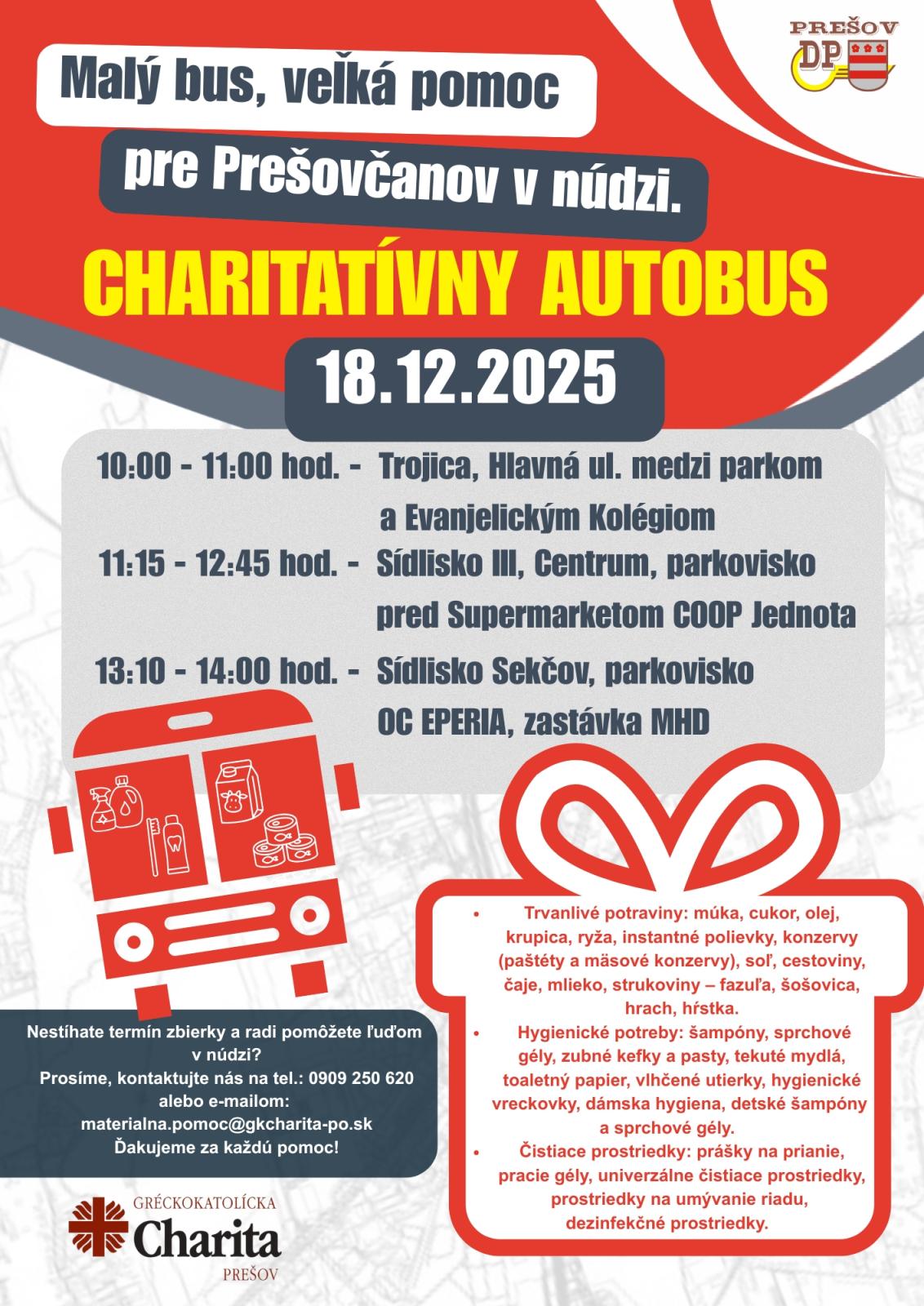 Malý bus, veľká pomoc pre Prešovčanov v núdzi – tak znie hlavná myšlienka predvianočnej zbierky Charitatívny autobus, ktorá sa uskutoční v uliciach Prešova. Do zbierky sa môže zapojiť každý, kto chce urobiť dobrý skutok, a to jednoduchým darovaním základných hmotných potrieb určených pre jednotlivcov alebo rodiny v núdzi, ktoré si z rôznych dôvodov nemôžu dovoliť prežiť obdobie vianočných sviatkov v dostatku.