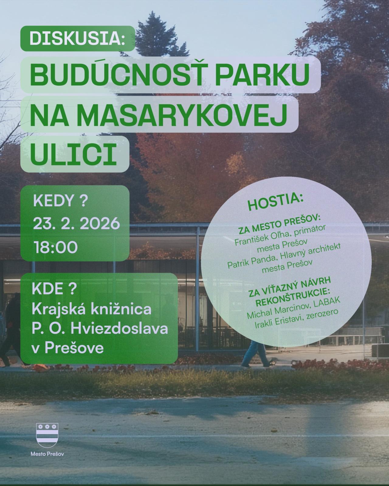 Prešovská radnica organizuje pre verejnosť diskusiu k pripravovanej obnove parku na Masarykovej ulici. Cieľom je priblížiť procesy, ktoré sa realizovali v posledných mesiacoch bez veľkej medializácie, no zabezpečili jasnú predstavu o budúcej podobe parku, ako aj finančné krytie celej obnovy. Súčasťou diskusie bude aj prezentácia ostatných návrhov, ktoré sa zapojili do krajinársko-architektonickej súťaže. Stretnutie sa uskutoční v pondelok 23. februára o 18:00 hod. v Krajskej knižnici P. O. Hviezdoslava v Prešove na Slovenskej ulici č. 18.