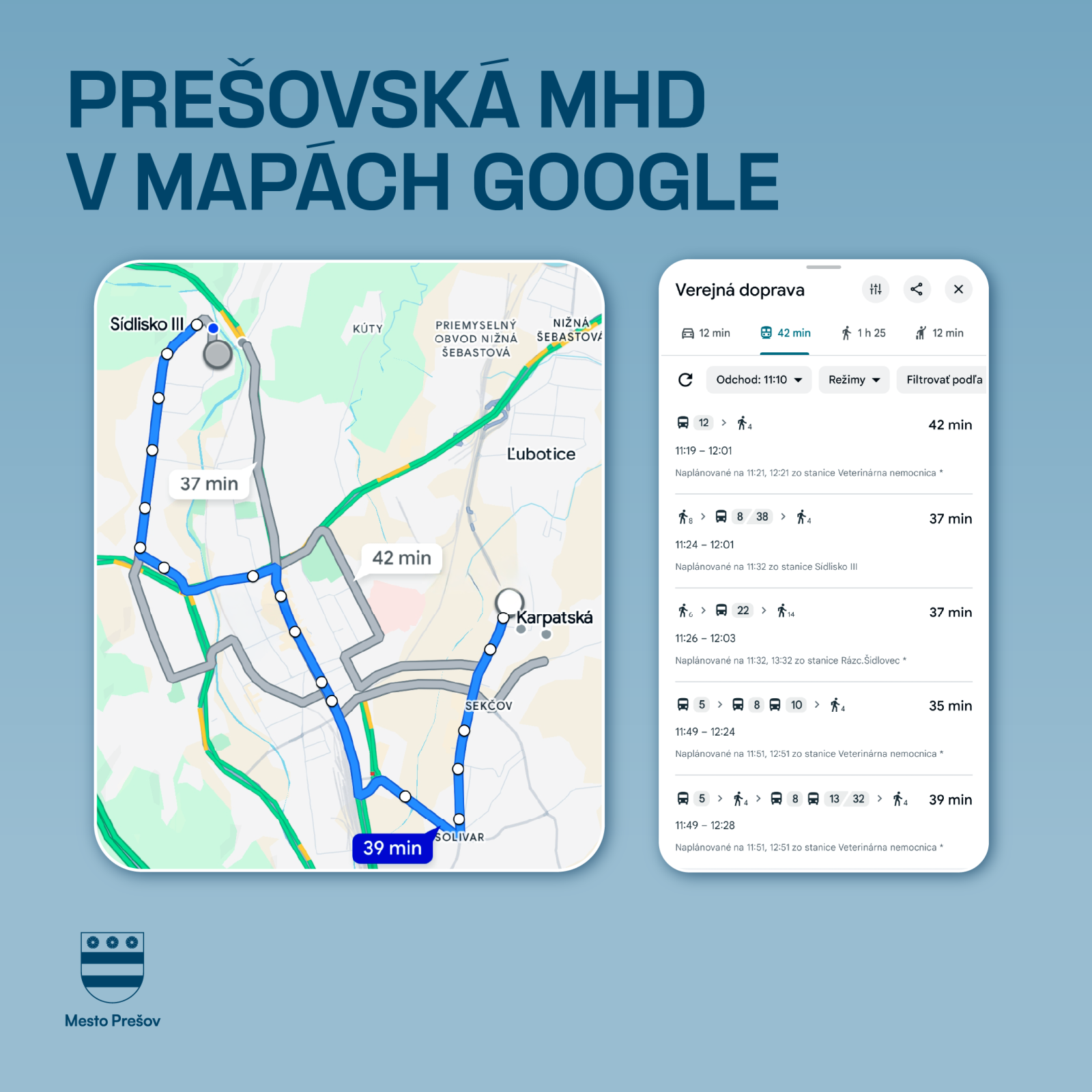 „Integrácia cestovných poriadkov do platformy Mapy Google výrazne zvyšuje dostupnosť informácií o spojoch MHD najmä pre návštevníkov mesta, dochádzajúcich študentov, turistov, ale aj pre nových obyvateľov Prešova. Vyhľadávanie spojenia MHD je už funkčné a ponúka užívateľom všetky užitočné informácie na jednom mieste, vrátane časov odchodov spojov, prestupov a predpokladanej dĺžky trasy,“ uviedol primátor mesta Prešov František Oľha.